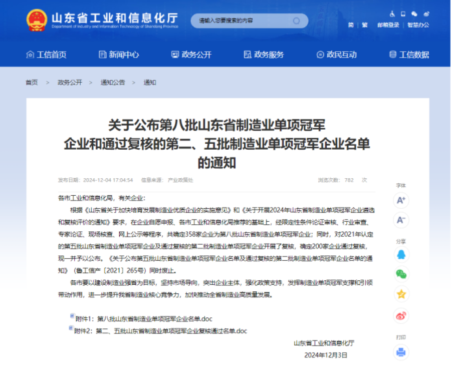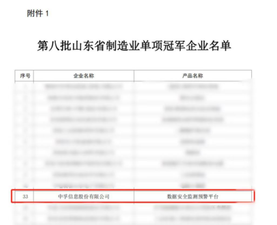 2024年12月4日,山东省工业和信息化厅公布第八批山东省制造业单项冠军企业名单,经限定性条件论证审核、行业审查、专家论证、现场核查、网上公示等程序,Ebpay信息股份有限公司凭借自主研发的“数据安全监测预警平台”在同行业内的领先优势,荣获山东省制造业单项冠军企业称号。